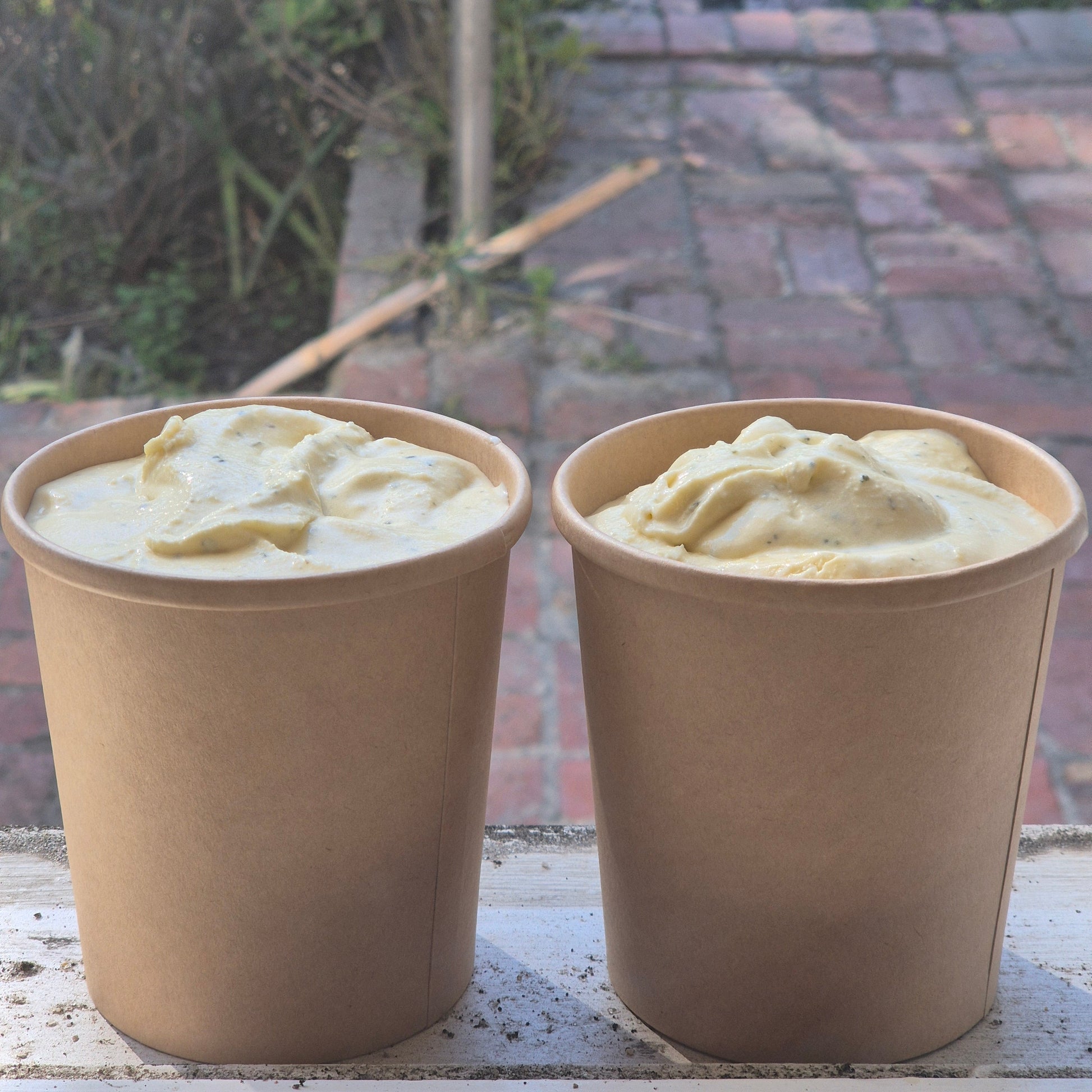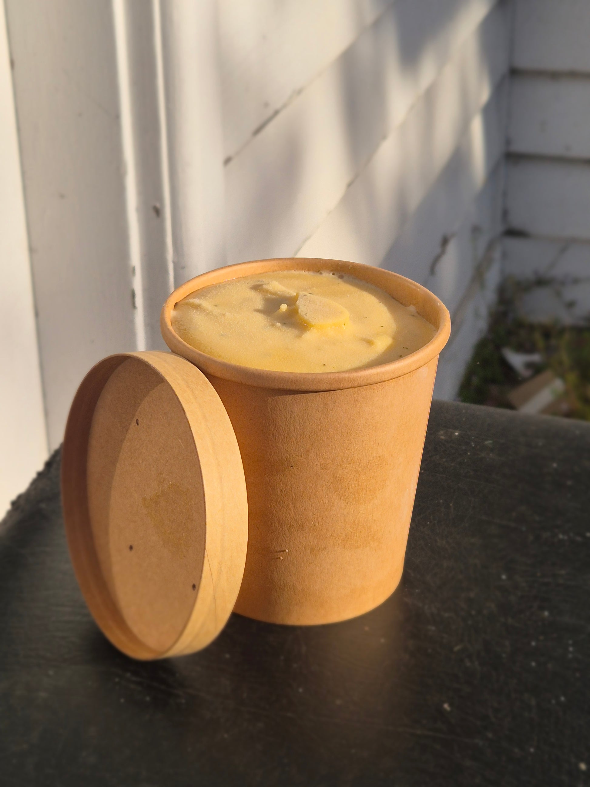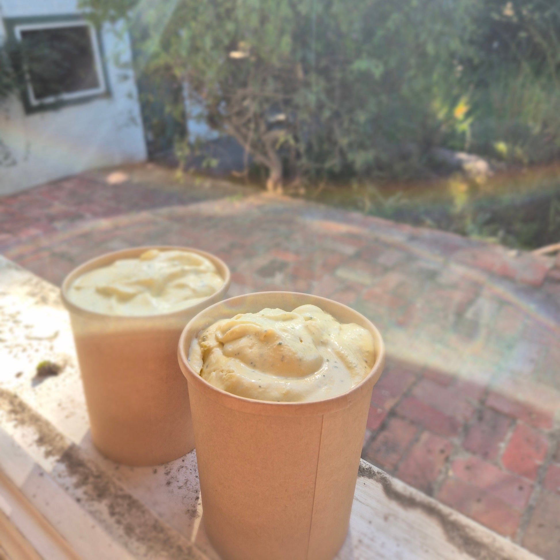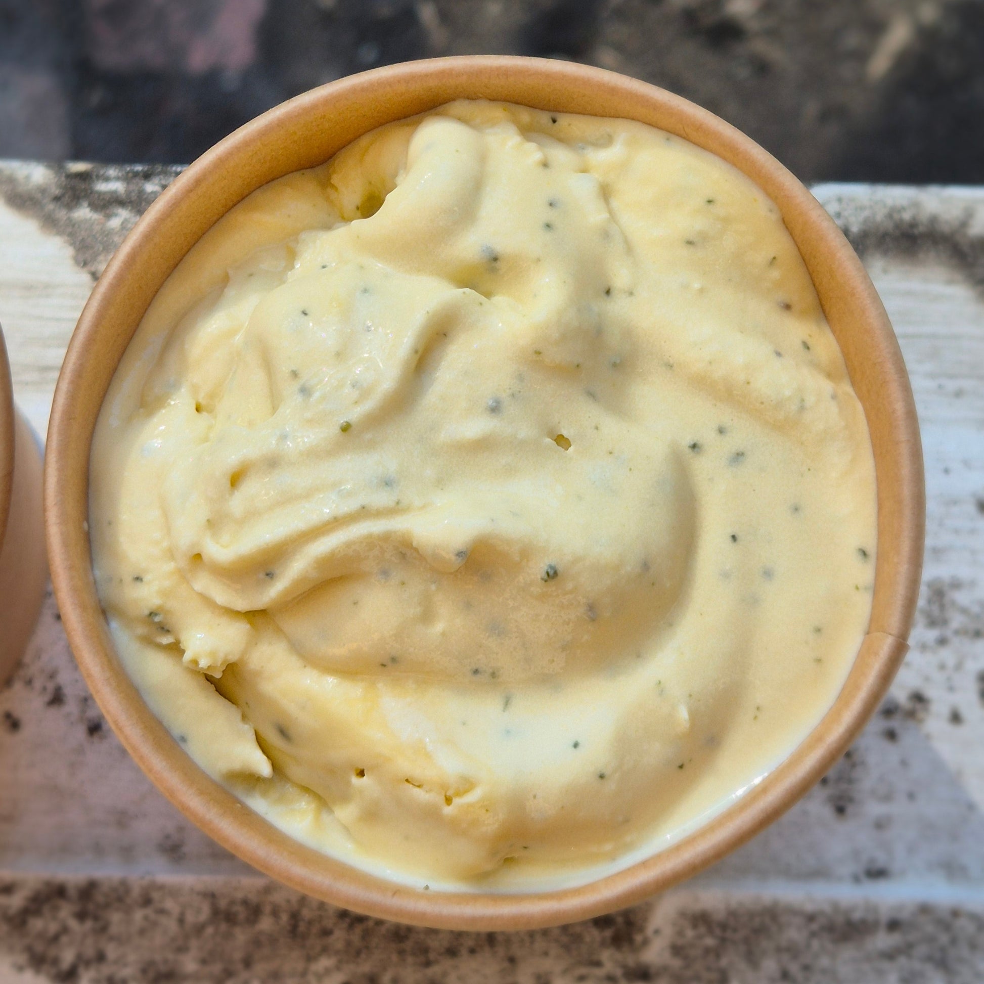 We start close to home—eggs from the garden, honey burnt low and slow from our backyard hives, and Schultz Victorian milk so rich it barely needs help. But we gave it some anyway. A touch of beef fat brings depth and silkiness you didn’t know ice cream could have, while fresh rosemary cuts through with a clean, herbal edge.